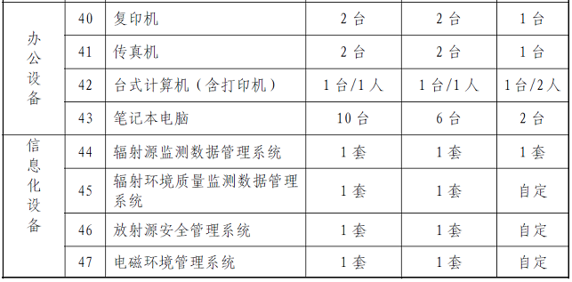 基本仪器设备是保障辐射环境监测与监察机构开展辐射环境质量监测(包括土壤、空气、水体、生物样品、陆地、口岸、海洋、电磁等项目的环境质量监测)、核设施和辐射源监督性监测(包括各类核设施、铀矿冶、放射性废物处理处置设施、电磁辐射设施、放射性同位素与射线装置、伴生放射性矿等)、日常核与辐射安全监督检查和执法的基础条件。辐射环境监测与监察机构必须配置的仪器设备的最低配备标准见表4。